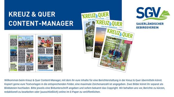 Dort könnt ihr zügig die Felder ausfüllen, euren Text reinkopieren sowie Bilder hochladen. Dies gilt für alle Inhalte (=Content), seien es Berichte, Wandertipps, Nachrufe oder andere News, die ihr veröffentlichen möchtet. Wichtig dabei ist, dass ihr die Textlängen beachtet, denn nur so können wir möglichst vielseitig in unserem Mitgliedermagazin über die Vereinsaktivitäten berichten. Benutzername und Passwort senden wir euch gerne zu. Mail an redaktion@sgv.de.